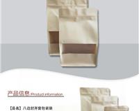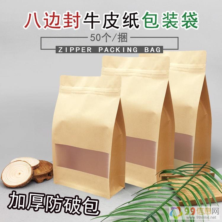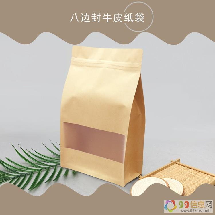 开窗牛皮纸自封袋主要将牛皮纸,PE膜 [4] (用普通设备制作夹链自封袋 [5] ),哑光磨砂膜,通过复合工艺将这几种材料压合在一起,形成美观大方的具有磨砂可视的复合袋 [6] 包装袋。不开窗牛皮纸自封袋主要铝膜,牛皮纸,磨砂PE膜三层复合在一起,形成不可视不开窗口袋99信息网。八边封牛皮纸自封袋是通用模具将袋型做成立体包装袋,因牛皮纸立体袋有八条边而得名“牛皮纸八边封袋”。